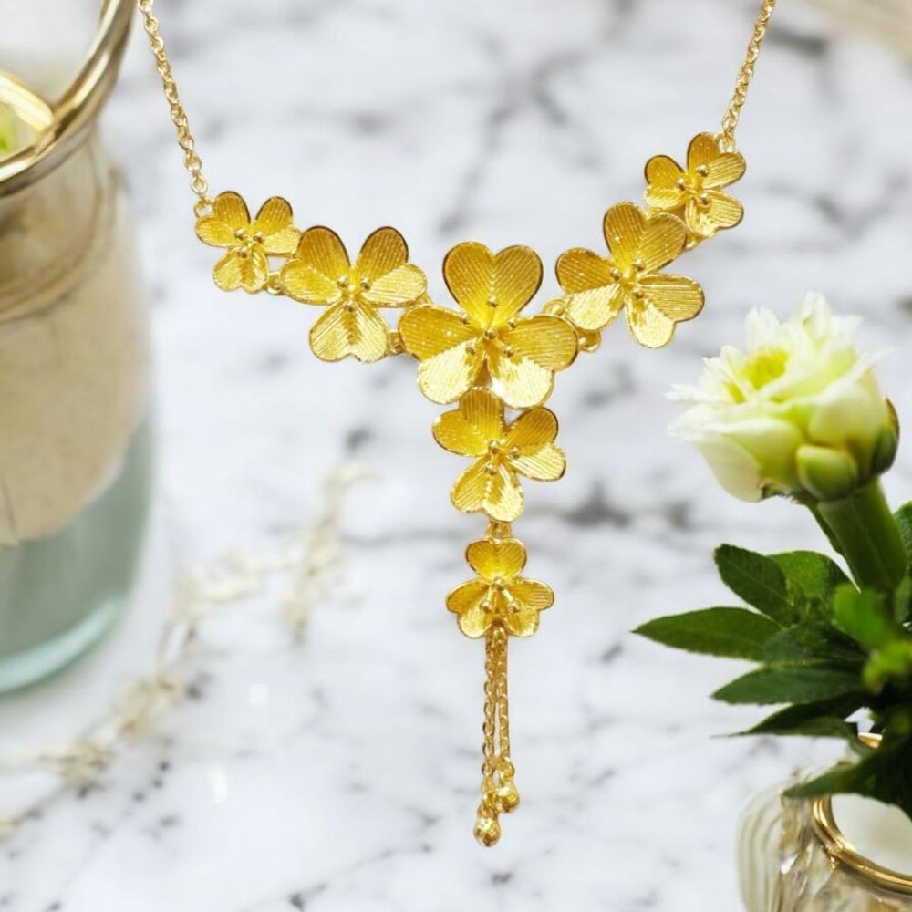 這款項鍊由我們公司以高品質黃金打造,展現出我們對於工藝的執著與專業,從設計到製作,每一個細節都經過精細雕刻,讓每一片花瓣都呈現出自然之美與細膩的紋理,這不僅僅是一件飾品,更是一件藝術品,象徵著我們品牌對於美與品質的承諾。